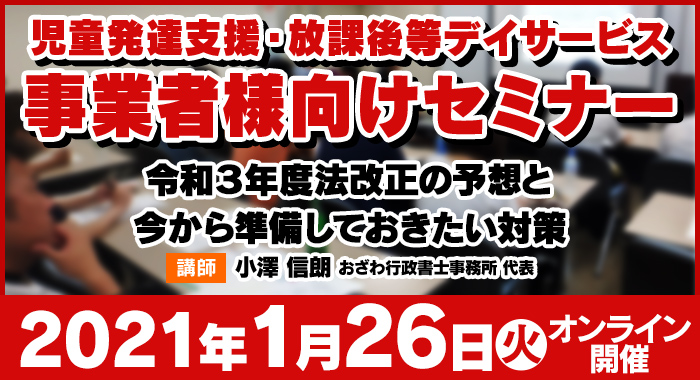 もう間もなく行われる法改正に向けて、2021年1月26日(火)に放課後等デイサービスの開設・運営コンサルタントとして介護業界を支える行政書士の小澤 信朗先生によるセミナーが開催されます。