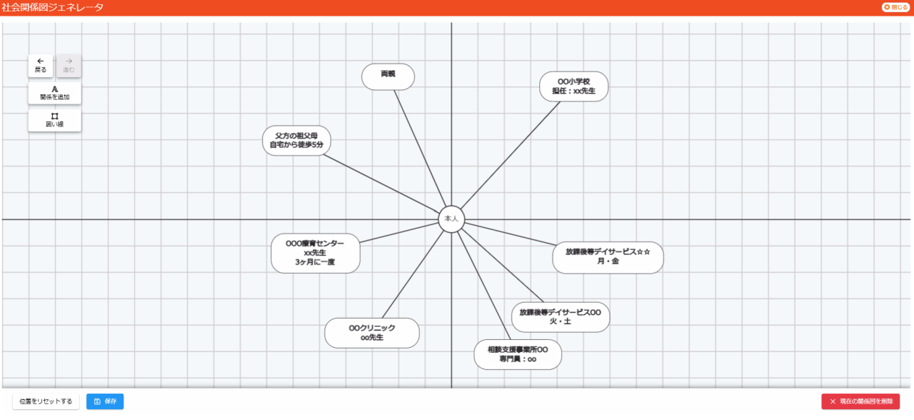 今回の相談支援事業への対応に伴い、国保連請求データの作成はもちろん、アセスメントやサービス等利用計画作成、家族関係図(ジェノグラム)の作成や社会関係図(エコマップ)の直感的な操作での作成、利用者様の帳票への電子署名、利用者様専用マイページへの代理受領通知書の開示等にも対応し、相談支援事業所を運営される皆様にとっても、より使いやすいシステムとなるよう対応しております。